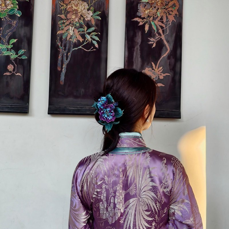 The purple chrysanthemum inherently carries an air of nobility and mystery, making it a perfect symbol of unique temperament! We take deep purple as the main tone, accentuated by a touch of vivid blue, creating a high-end color scheme full of texture. The butterfly’s body is crafted with exquisite beading techniques, complementing the soft chrysanthemum beautifully. The overall design is lively and vivid, as if it will flap its wings and perch among the flowers in the next second.